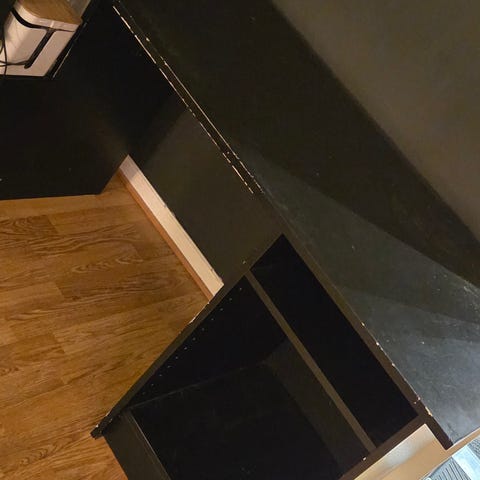 Opprinnelig en skrivepult fra Jysk. Har lagt kontaktplast i terazzostil og sprymalet bena beige/rosa. Ikke veldig pent gjennomført, så kan ha behov for ei runde med ny spraymaling. En liten glipp med kontaktplasten i hjørnet.