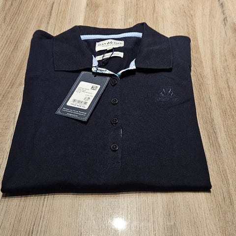 Jean Paul Poloskjorte i størrelse M for damer. T-skjorten er hvit og laget av bomull. Den har korte ermer med stripete detaljer på innsiden av kragen og ermene.