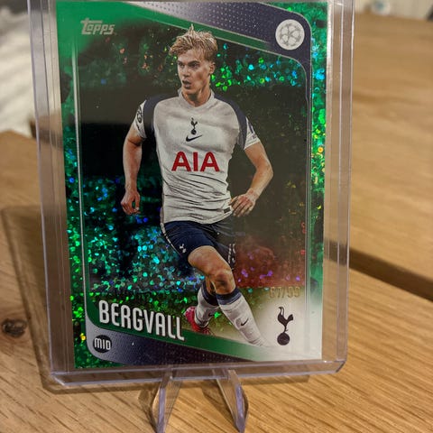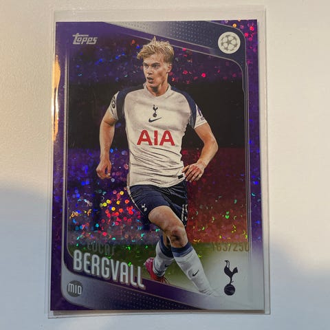 Topps Lucas Bergvall fotballkort fra sesongen 2025/26. Kortet viser Lucas Bergvall, midtbanespiller for Tottenham Hotspur, med bilde og informasjon på kortet.