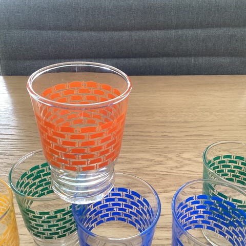 Virkelig stilige vintage dessertglass fra IKEA. Alle 6 i topp stand. Høyden er 11 cm. Kan sikkert brukes som både vannglass / ølglass mm. Behagelig grønnfarge.