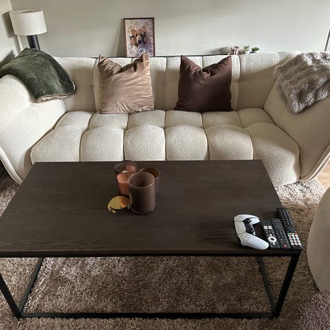 Selges fordi den dessverre blir for bred nå når vi får ny planløsning, så vi må ha en smalere sofa. Den er 235 cm bred fra armlene til armlene, 98 cm dyp, 84 cm høy og sittebredde er på ca. 190 cm.