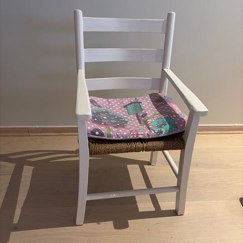 Sjarmerende hvitmalt gyngestol i tre, perfekt for barn. Klassisk design som passer fint på barnerommet eller i stuen. Stolen er solid og stabil, men har noe normal slitasje/bruksmerker i lakken (se bilde).