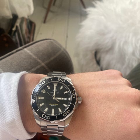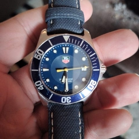 TAG Heuer unisex klokke med rustfritt stål lenke og kasse. Klokken har en blå urskive med tydelige markeringer og roterende bezel. Egnet for daglig bruk og formelle anledninger.