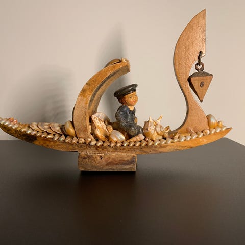 North Hollywood dekorativ vogn laget av metall og plassert på en steinbase. Vognens design inkluderer detaljer som hjul og en tilhørende liten metallgjenstand. Passer som dekorasjon eller samlerobjekt.