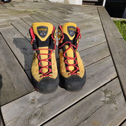 Selger et par Asolo Cholatse TH carbon/kevlar isolerte mountaineeringsko med snow gaiter/snømansjetter. Kostet rundt kr 6.000 for noen år siden. Stått i skapet, brukt noen få ganger, fortsatt mye nytte igjen for den som vil ha en god sko på lite budsjett.