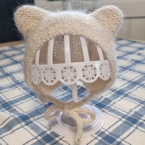 Nystrikket lillebjørn lue med votter🌟 størrelse 0-3 mnd. Passer gutt, farge lys blå.