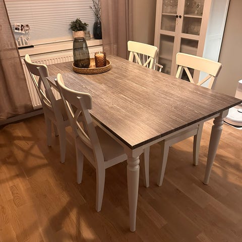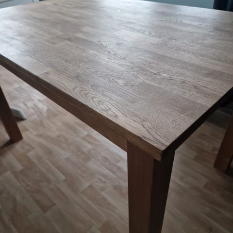 Noen flekker på bordflaten nå, men det er bare å slipe ned evt og ha på matolje igjen. Bordflaten er nettopp oljet så ser derfor kanskje det på bildene.