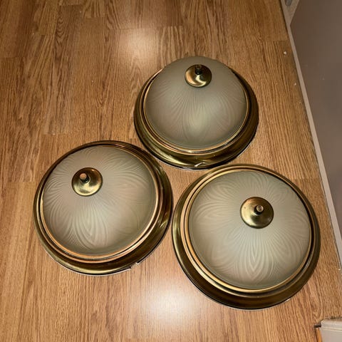 Taklamper. Børstet messing. Frostet glass. Diameter 26 cm. Dybde 15 cm. 200 kr pr stk