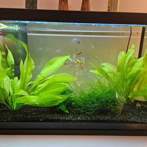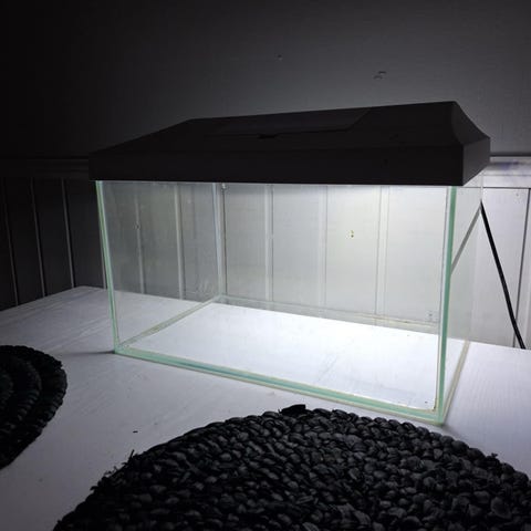 Akvarium med 2 kinesiske trekjølskilpadder og 1 sugemalle. Inkludert pumpe, filter, varme- og belysningsutstyr. Inneholder vannområde, landingsplasser og dekorasjoner som trestammer og steiner. Sugemalle hjelper til med å holde akvarium rent.