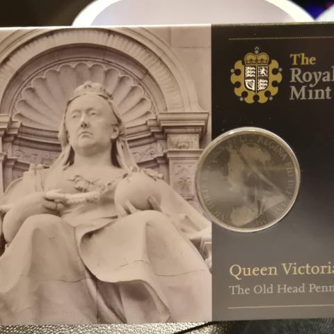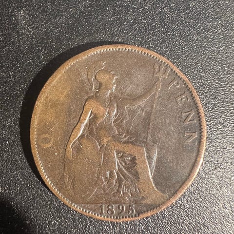 Britisk Penny mynt fra 1901 med motiv av dronning Victoria på forsiden og en sittende figur på baksiden. Mynten er laget av kobber og har historisk verdi.