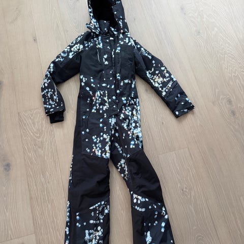 Romslig str 92, ingen gull, og strikker følger med. God og varm dress vi har brukt på et barn. Molo lager kvalitetsdresser som er gode å bevege seg i og har kult mønster. Nypris 1899