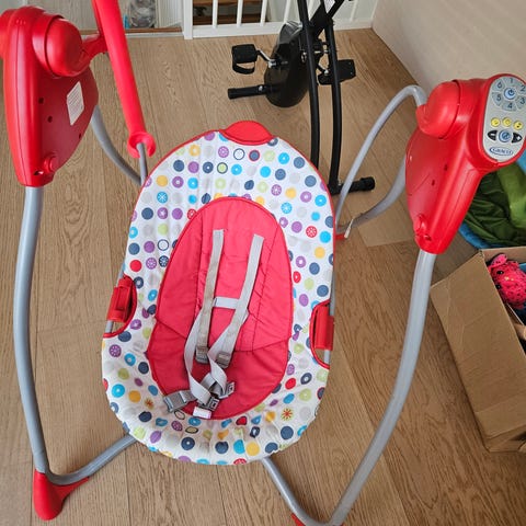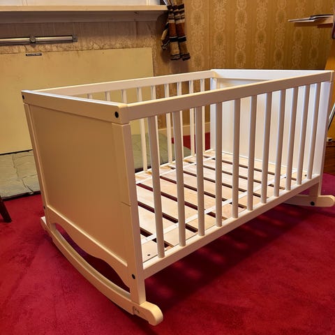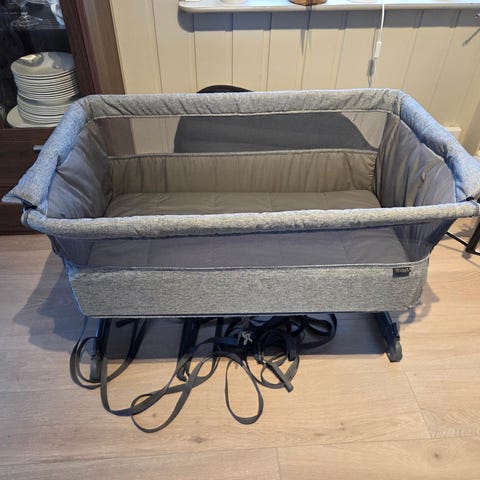 Yngri bedside crib selges. Den er nesten ikke brukt da vi veldig fort endte med samsoving. Ingen bruksmerker. Madrassen er som ny. Sengen kan åpnes på siden for å feste til foreldrenes seng. Høyden kan også justeres. Bånd til å feste til sengen medfølger.