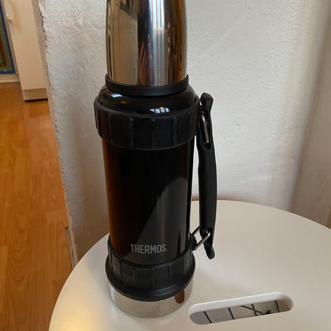 Åpnes med lokk. Holder veldig godt på varmen. Lekker ikke i det hele tatt. En veldig god termos, men selv trenger jeg den ikke da jeg har en annen.