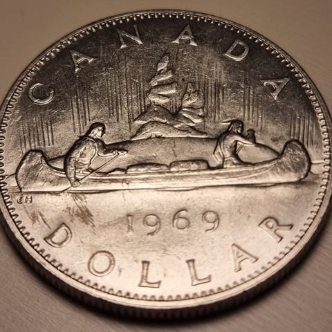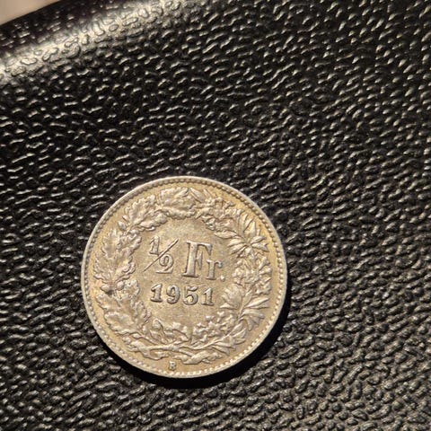 Sveitsisk 5 franc mynt fra 1954 med motiv av en person i kappe på forsiden og sveitsisk skjold omgitt av laurbærkrans på baksiden. Mynten er laget av sølv