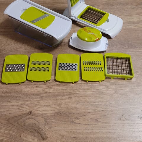 Inkluderer kniver til fin og grov strimler, fin og grov rivjern, fin og grov kutter, samt mandolin-kutter, beholder og beskyttelses-håndtak.