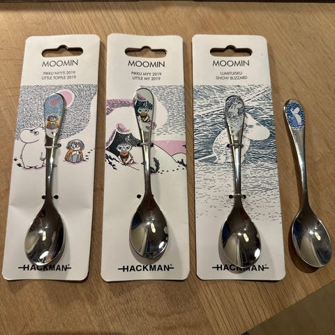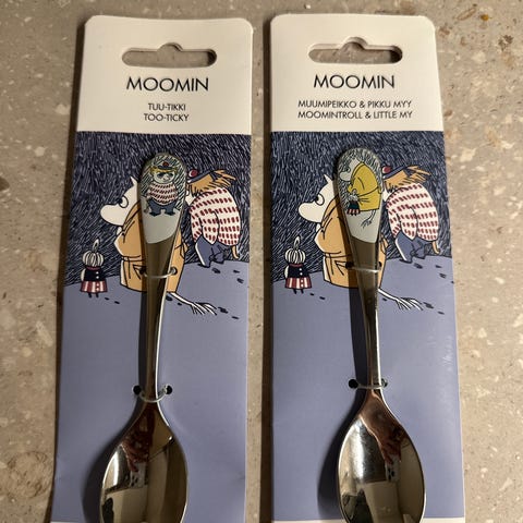 Hackman Moomin bestikksett med fire deler. Består av gaffel, kniv, spiseskje og teskje med Mummitrollet-motiv. Materiale i rustfritt stål. Helt ny, uåpnet pakke. Kjøpt på Jernia. Denne utgaven er nå utsolgt i alle butikker og på nett. Kostet 479 kr ny.