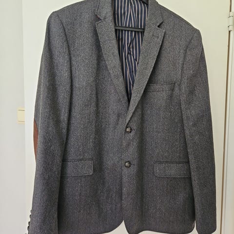 Dressmann tweed jakke i grå farge, størrelse 56 for herre. Jakken er laget av tweed materiale og egnet for formelle eller semi-formelle anledninger.