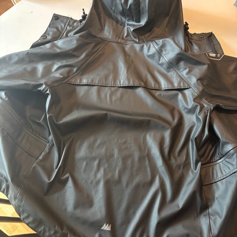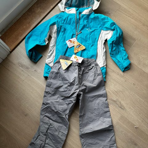 Svart regnsett. Jakke er av merket Skogstad med hette og bukse er av merke Helly Hansen med strikkregulering i livet og trykk-knapper på beina. Strl 140/10 år på begge delene.
