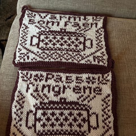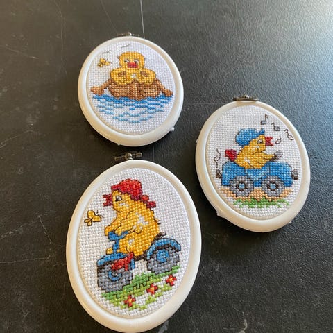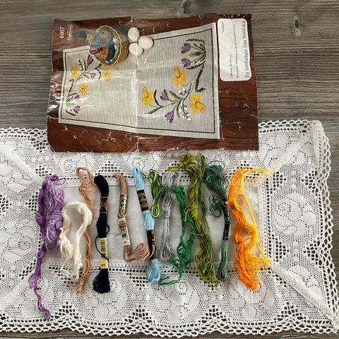 Sydd brødkurv i bomullsstoff og strikket eggevarmere. 5 stk