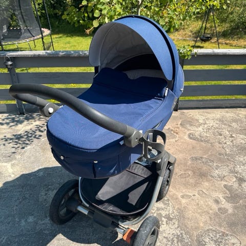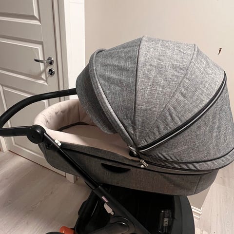 Stokke barnevogn med liggedel og sittedel i grå farge. Barnevognen har justerbart håndtak, stor kalesje, og god oppbevaringskurv under setet. Passer for nyfødte og små barn, designet for komfort og funker fint.