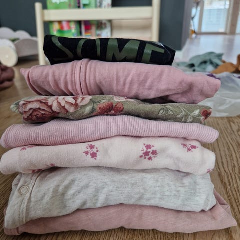 Hjemmestrikket, bodyer, kjoler, luer, skinnvotter og noe ull blant annet.