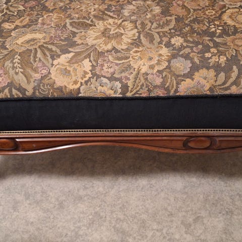 Gammelt bymøbel: Sjeselong - antikk. Trukket om på begynnelsen av 90 tallet. Gylden farge, med elegant mørkt treverk. Damask/brokade - vevd i jacquard teknikk. Stoffet er ikke slitt, men sofaen er veldig gammel.