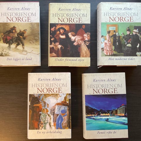 Karsten Alnæs Historien om Norge bokserie bestående av 5 bind. Serien dekker ulike perioder i Norges historie med titler som 'Det ligger et land', 'Under fremmed styre', 'Mot moderne tider', 'En ny arbeidsdag’ og 'Femti rike år’ Bøkene har hardt omslag og gir en omfattende historisk oversikt.