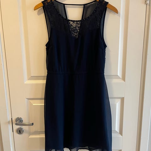 Pen blå kjole fra Nelly med blondedetaljer, pent brukt. Noe liten i størelsen