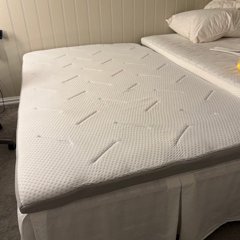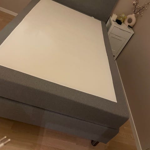 Senga er lite brukt, og har ingen synlige flekker eller skader. IKEA Overmadrass av typen Talgej følger med.
