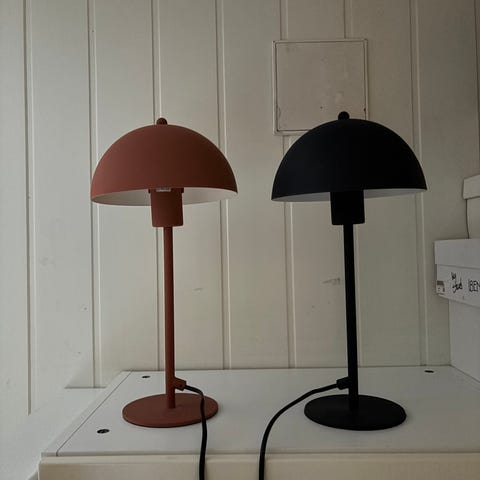 Lampen kan enkelt justeres i høyden etter behov og gir et varmt og fint lys gjennom den hvite lampeskjermen.