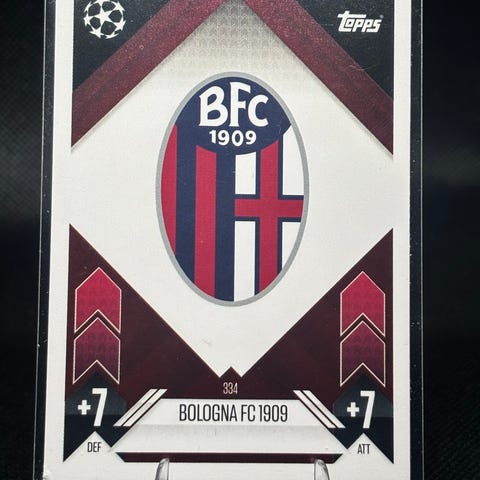 Topps Match Attax Bologna FC 1909 fotballkort med klubbens logo og grafisk design. Kortet er en del av et samlekortspill og viser klubbens emblem og tilhørende grafikk.