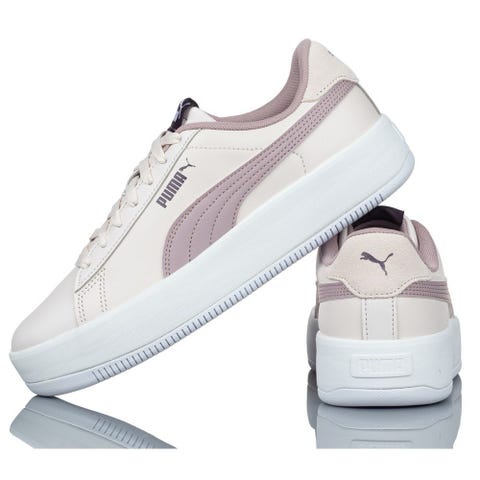 Puma Sneakers joggesko i størrelse 38. Skoene har en beige overdel med svarte detaljer og hvit såle. Materialet ser ut til å være semsket skinn eller lignende. Passer til hverdagsbruk.