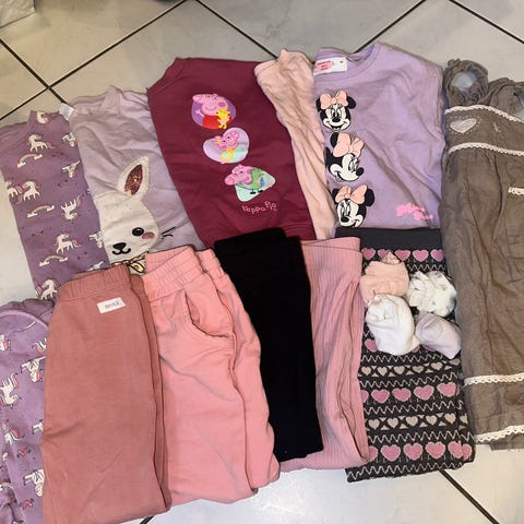 Liten klespakke med 3 bukser, 3 jumpere, 2 gensere, 4 strømpebukser, tanntøy, ulltøfler, 1 ullbukse, 1 fleecebukse, 2 fleecejakker og 2 fleecedresser.