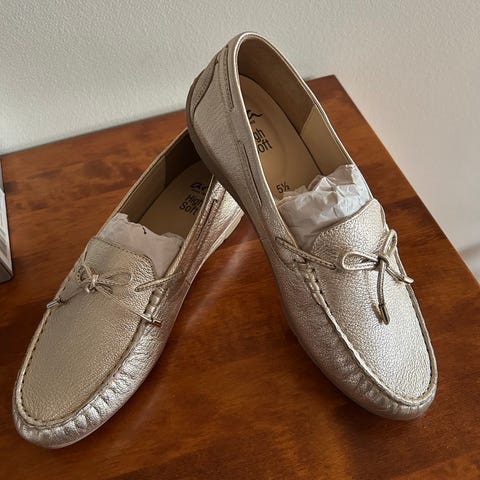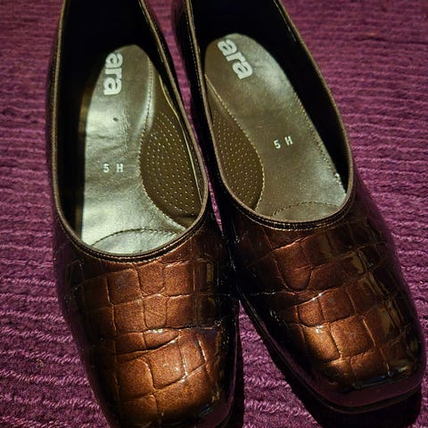 Ekte skinn mokasiner mrk Ara, pent brukt. Gjennombrutt mønster på sidene i hvitt skinn og '"strass" pynt foran på grått skinn. Gummisåle, ca 1 cm hæl.