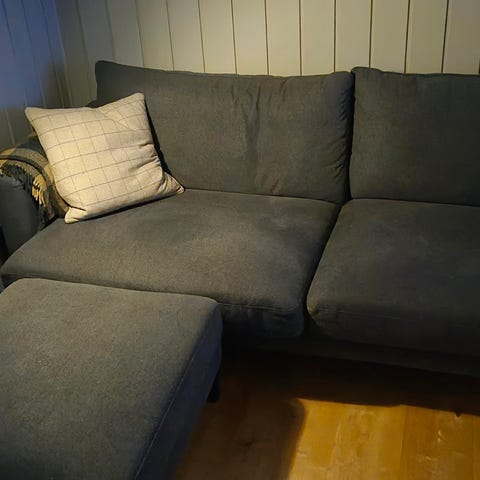 Sofaen har endel katteklor på sidene, men er ellers lite slitt og god å sitte i.