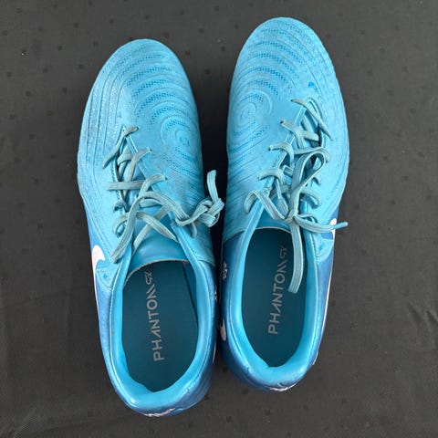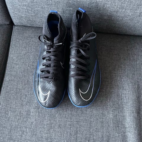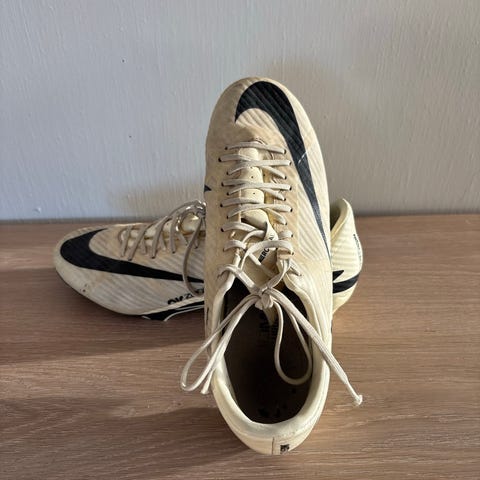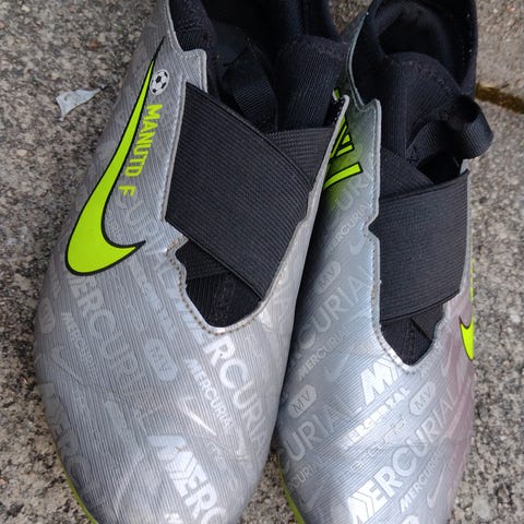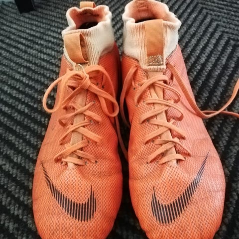Nike Mercurial fotballsko i grå og oransje farge. Skoene har knotter for bruk på gressbaner og en sokkelignende ankel for støtte. Egnet for fotballspillere som trenger sko med god grep og passform.