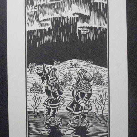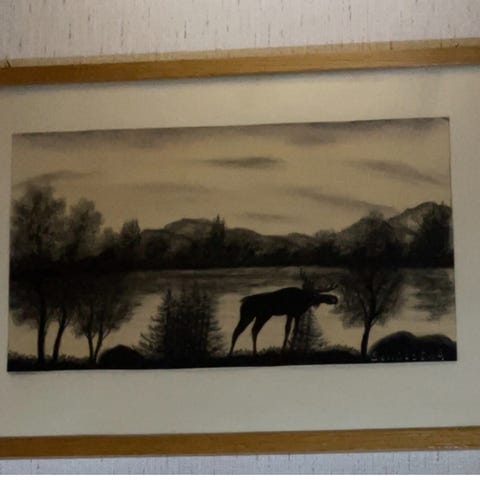 Svart-hvitt kullstifttegning med ramme