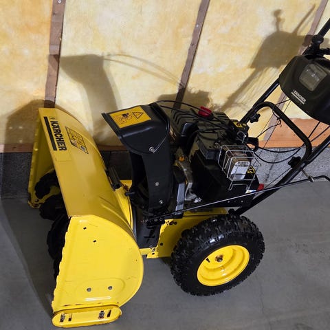 Kärcher snøfreser. Ser ikke ut som da den var ny, men gjør fortsatt en god jobb. Usikker på alder, har arvet den. Den starter på snor, men ved test av elstart, så går sikringen. En kortslutning her altså, som jeg ikke har sett noe nærmere på.