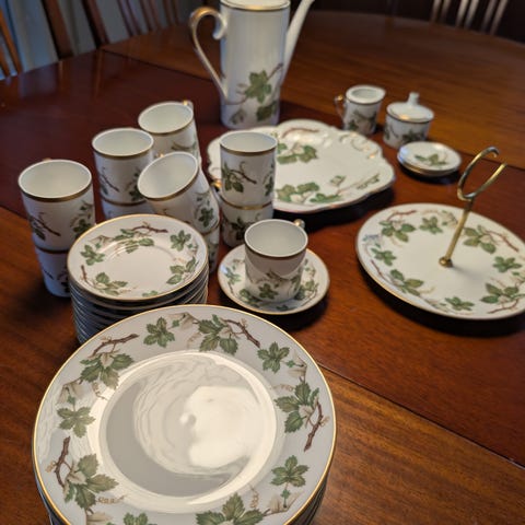 Ett motiv - to forskjellige produsenter og til og med land. Hackefors porselens Sweden desserttallerkener og Seltmann Weiden Bavaria espressokopper med fat. Svært elegant og vakkert motiv med drueblader. Som ett sett: 6 tallerkener + 6 espressokopper + 6 fat.