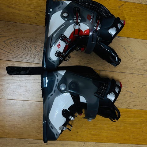 Nordica Mach 1 alpinski med bindinger, inkludert støvler og staver. Skiene har en klassisk hvit og rød fargekombinasjon. Støvlene er utstyrt med flere spenner for justering og komfort. Passer for alpinbruk.