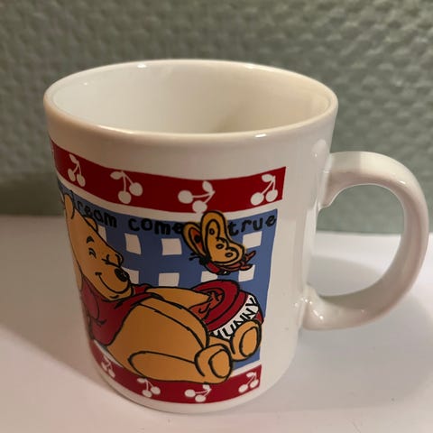 Sjarmerende Ole Brumm krus selges grunnet plassmangel. Med teksten Bee Happy. Perfekt som fast kaffekopp på jobb