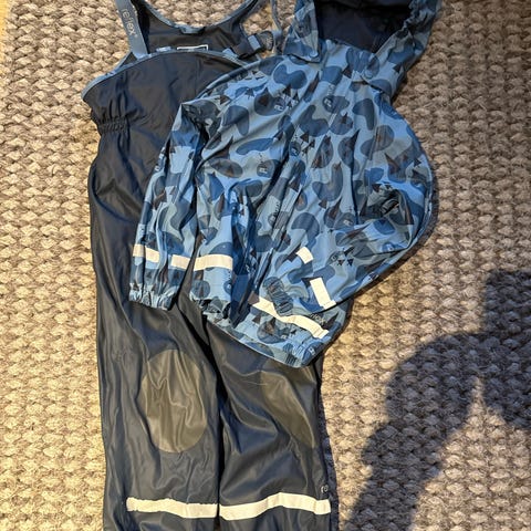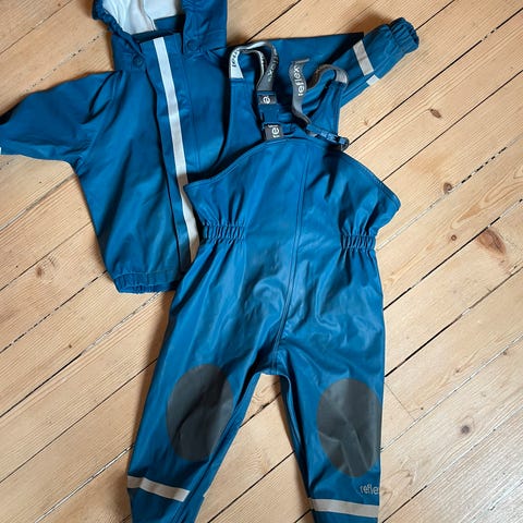 Regnsett fra Reflex i str 128. Har lagt ved bilde av en liten skade som er på baksiden av regnbuksen.