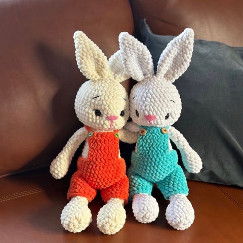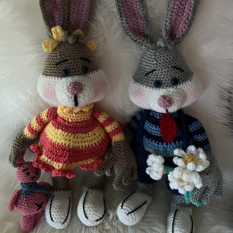 60 cm høy , hjemmeheklet kanin. Fyllt med vatt.