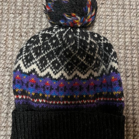 Klassisk pent hjemmestrikket lue i ull med pent norsk mønster, Maruis motiv. Myk og varm. Måler 27cm nederst liggende flatt. Hentes på Torshov. Heis. Buss 20 og 30 stopper rett utenfor.