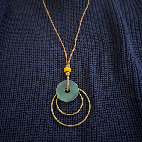 Halskjedet består av en svart plastsnor og sølvfargede metalldeler (metalllegering).