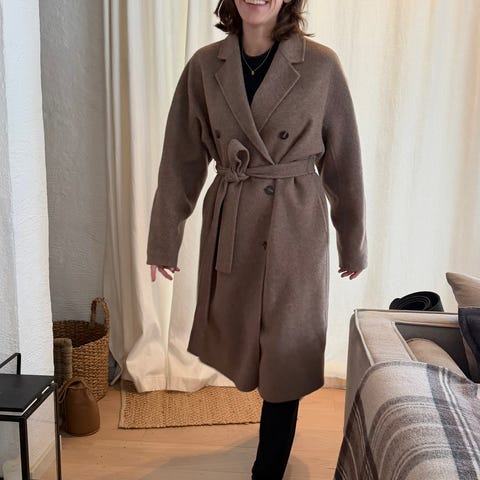 Marc Jacobs stilig og tidløs kåpe i kraftig ull av beste virgian wool kvalitet. Ullkvaliteten regnes derfor som bedre og dyrere enn annen ull. Kåpen er et «statement» plagg fra designeren Marc Jacobs. Normal i størrelsen, str 38/medium. Den er ca 86/87 cm rundt livet og ca 88 cm lang. Kåpen er lekker med stilig finish ved skuldrene og detaljer bak. Plagget har dobbelspent knappelukking med gull/messingfargede knapper og en klassisk krage. Kåpen er kjøpt av min mor i USA for noen år siden. Den fremstår som veldig fint brukt, ingen slitasje, eller lukt.