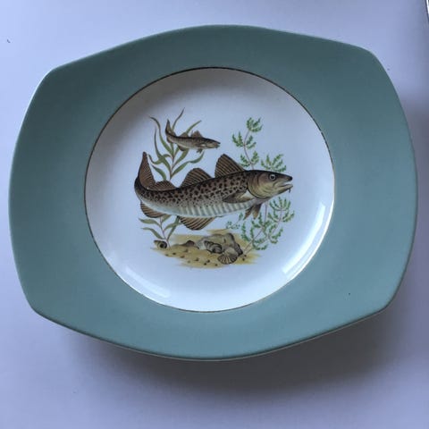 Morsomt fat med glad fisker som hilser på en glad tyrefekter. Spanske gloser med Markol reklame rundt. Produsert av Figgjo flint for 30-50 år siden som reklame for "MARKOL" et tranprodukt fra Johan Martens A.S.