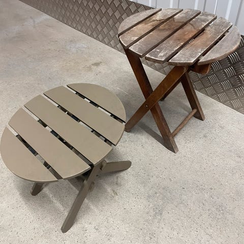 Klappstol i grønnbeiset tre. Kul som kjøkken/ekstra stol. Genial til å henge på vegg eller lagres vekk sammenslått.