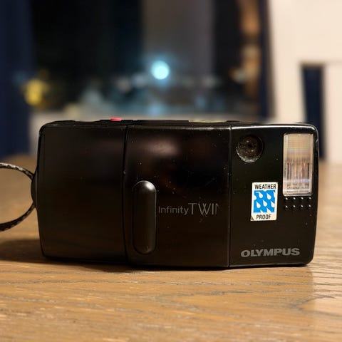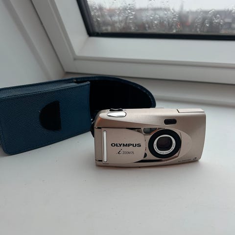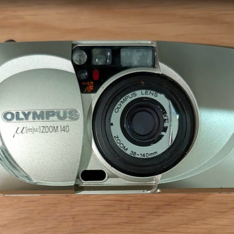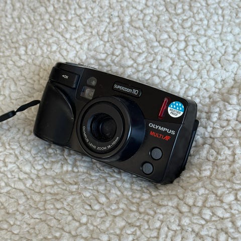 Olympus mju zoom panorama 35-70mm filmkamera i svart farge. Kompakt design med innebygd zoomobjektiv. Passer til analog fotografering med 35mm film.