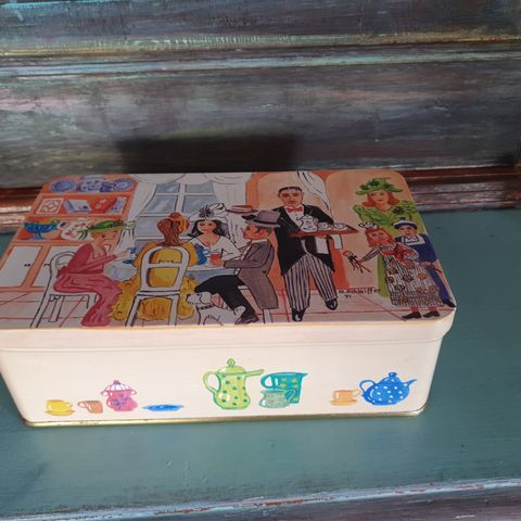 Nydelig, fargerik metallboks fra 70-tallet. Bunnfargen er turkis og ikke blå som det ser ut på bildene. Noen få bruksspor (blant annet etter en teipbit som satt på lokket) men generelt i veldig god stand.